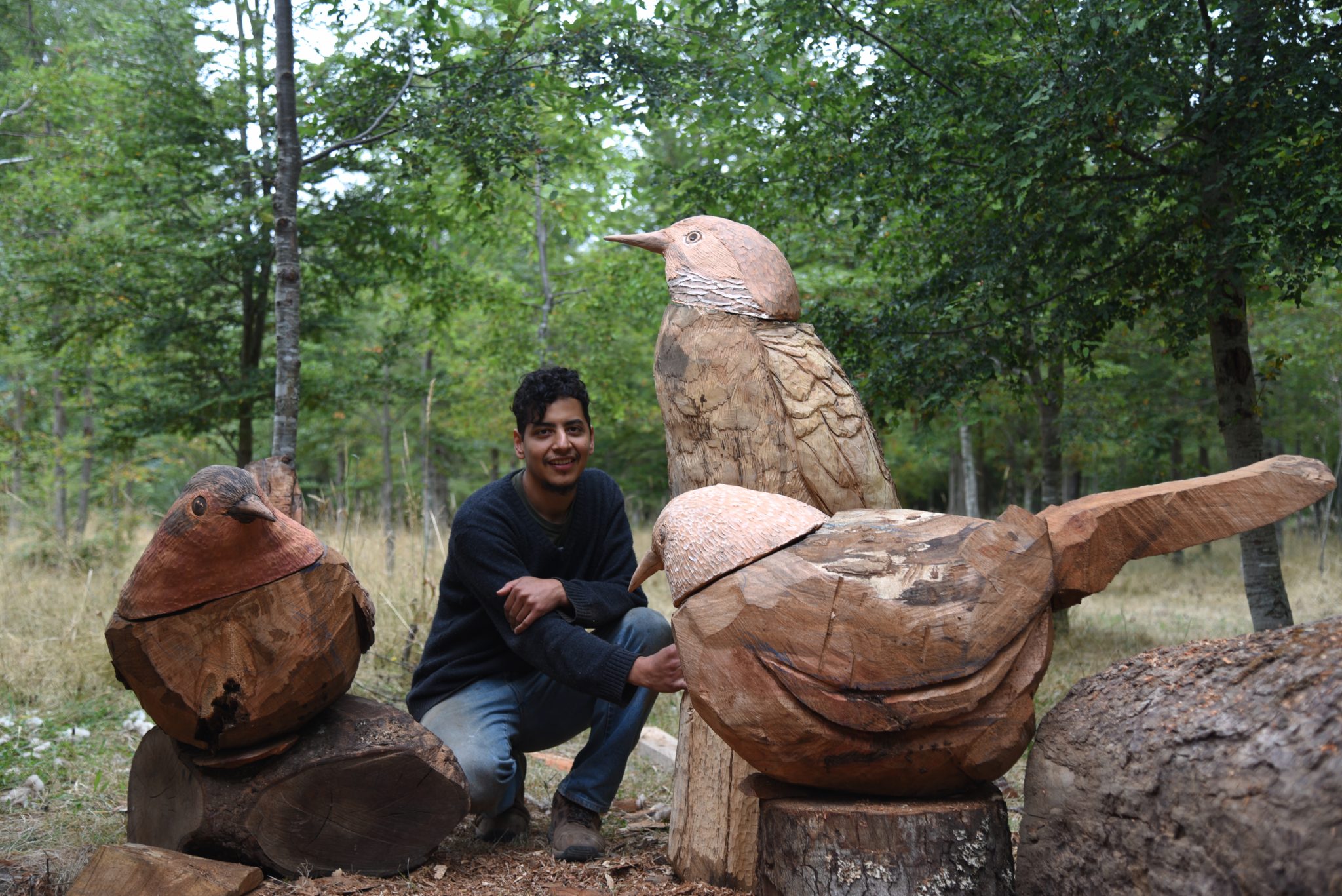 Quien ha dado vida a estas maravillosas piezas escultóricas sonoras, cuyo sonido emula el canto de los pájaros que representan, es un artista colombiano, Juan David Holguín. Él vive en estas tierras mapuche desde hace tres años, e hizo un acucioso estudio de las aves de esta preciosa comarca para presentar al Ministerio de las Culturas a través del Fondart Regional 2022, en la línea de Culturas Migrantes, adjudicándoselo.