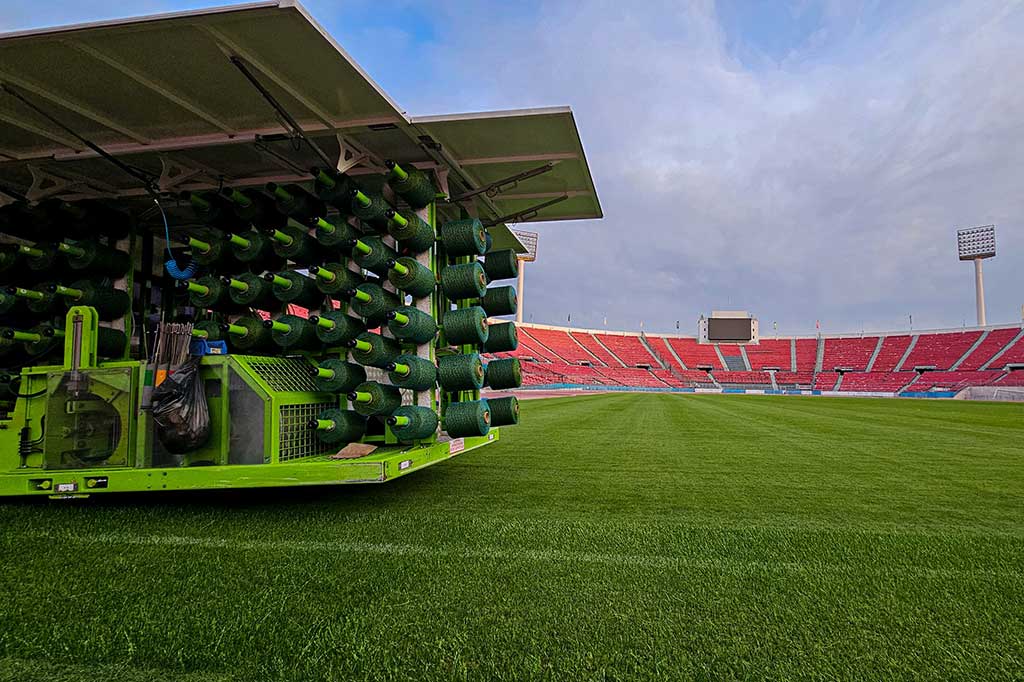 En preparación para el Mundial sub 20 Chile 2025, el Estadio Nacional de Ñuñoa implementa un innovador sistema de césped híbrido, combinando pasto natural con fibras sintéticas, mediante maquinaria especializada de última generación.