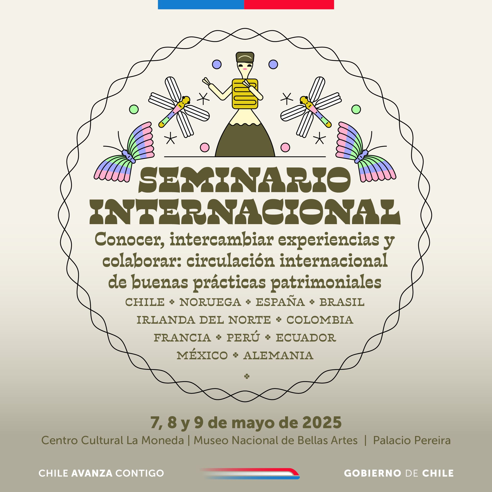 La actividad se desarrollará entre el 7 y el 9 de mayo de 2025 en tres espacios emblemáticos de la ciudad de Santiago: el Centro Cultural La Moneda, el Museo Nacional de Bellas Artes y el Palacio Pereira. El seminario es organizado por la Unidad de Estudios de la División de Planificación y Presupuesto del Serpat, con el apoyo de la Unesco, el Centro Cultural de España y la Embajada del Reino de Noruega.