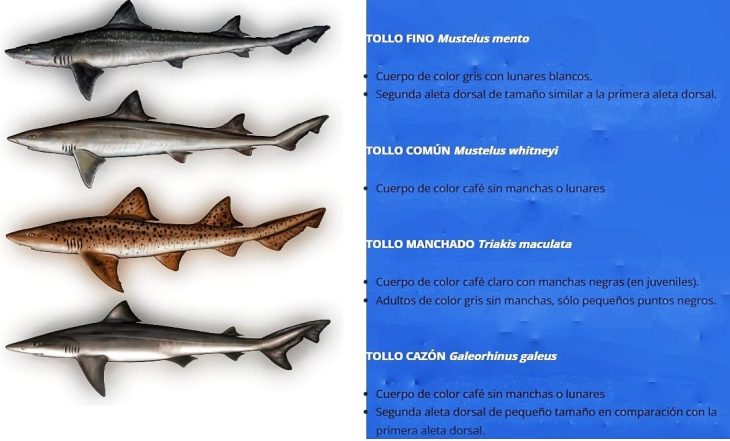 El matrimonio de los doctores en ecología marina Carlos Bustamante y Carolina Vargas dicen que las cuatro especies chilenas están en crítico peligro de extinción. A saber, el tollo común (mustelus whitneyi), el tollo fino (mustelus mento), el tollo manchado (triakis maculata) y el cazón (galeorhinus galeus). “El 80 por ciento de los especímenes que se venden son juveniles, es decir, nunca alcanzaron a reproducirse antes de ser capturados”, afirma Vargas Caro.