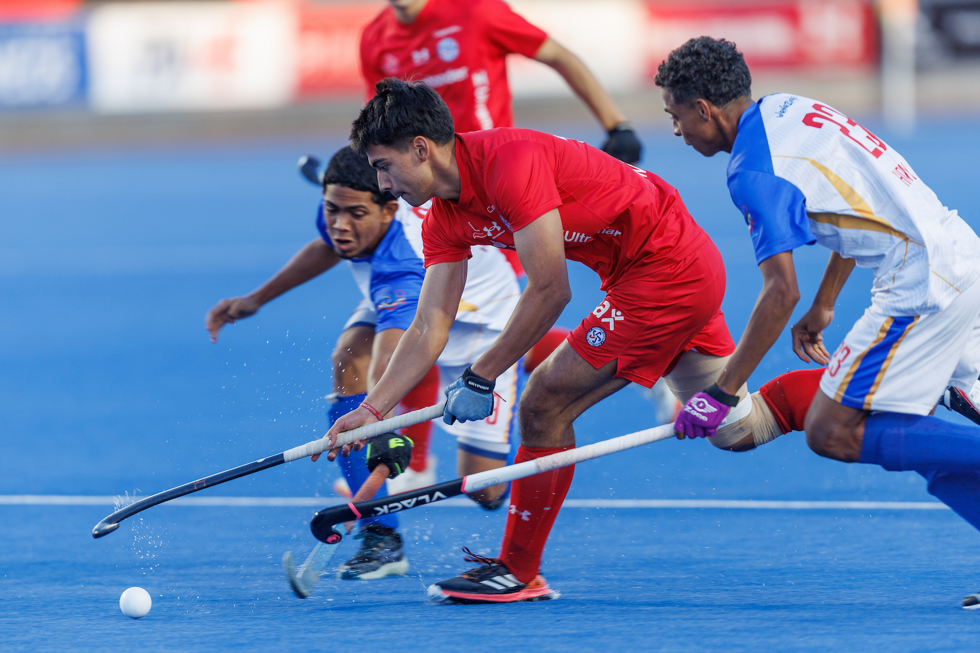 Los varones sub 21 de Chile se ordenaron en el sintético con un esquema de ataque: arquero, dos defensas, tres centros y cuatro delanteros para disputar el primer cuarto ante Venezuela en el Estadio Claudia Shüller del Parque Estadio Nacional.