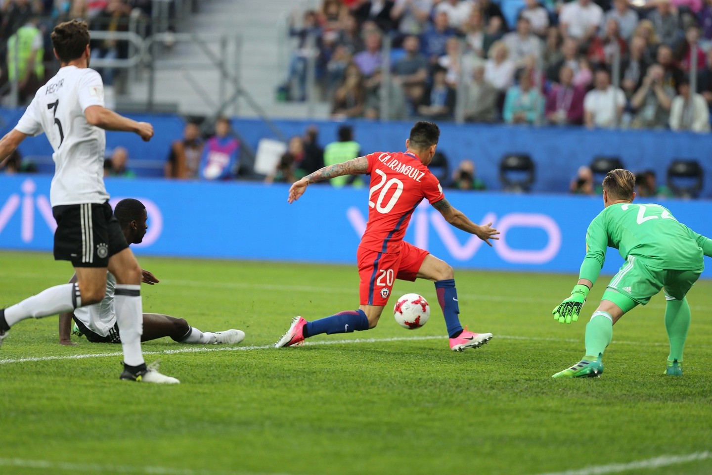 Fueron esos, sin duda, los únicos minutos favorables a Alemania. El inesperado gol teutón  había calado hondo y se notaba. Draxler, a los 40, desvió desde buena posición y a los 45, producto de otro error descomunal, esta vez de Jara, tuvo que achicar Bravo ante Goretzka para impedir lo que habría significado la segunda conquista alemana, a esas alturas no cabe duda, tan decisiva como demoledora.
