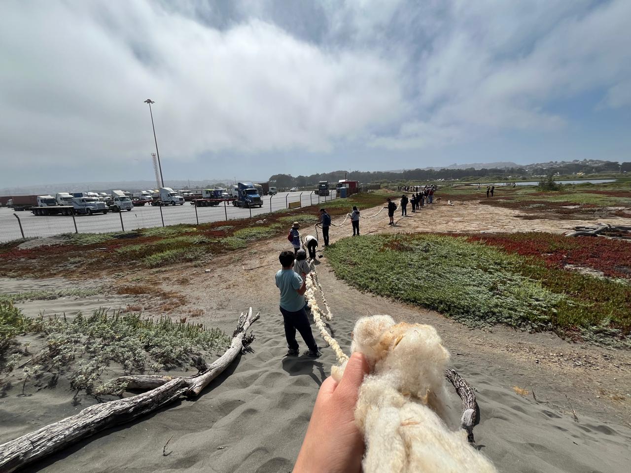 Después de que la gente se reuniera en el círculo, Vicuña llevó un extremo del quipu hacia el mar, mientras los y las asistentes hicieron una cadena humana para conducir la lana anudada hacia el humedal. Esto tomó una buena porción de la mañana y la alegría de haber unido ambas aguas fue el momento por el que la gente asistió. Después hubo momento para las fotos con la artista, el reconocimiento de rostros en común y se regresó al círculo para una breve charla con las comunidades involucradas: representantes de la comunidad mapuche, un sindicato de pescadores artesanales que no transan, la organización Ojos de Agua y la propia Cecilia, que cerró con unas palabras tan suaves como la brisa que recorría la costa.