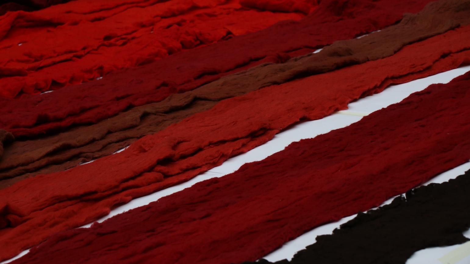 Al entrar al hall del museo, lo primero que uno se encuentra es una gran instalación titulada “Quipu menstrual” (“La sangre de los glaciares”), hecha de lanas naturales teñidas a mano con tonos rojos y terracota, quizá aludiendo a la hematita, cuyo significado es “sangre como piedra”. Tal vez la metáfora es pensar las montañas, la cuna del agua, como sangre. Montañas de sangre, sangre de montañas.