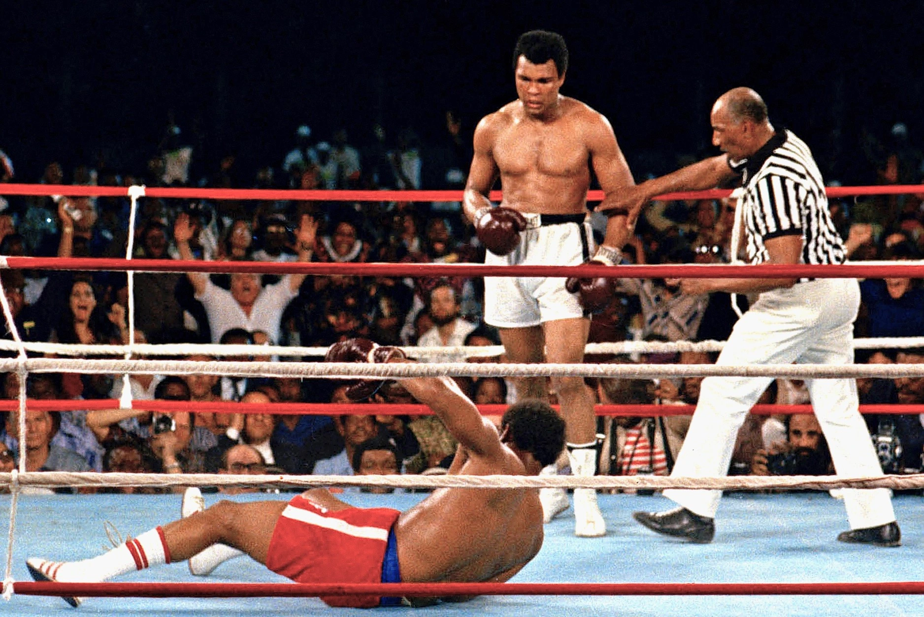 En lugar de impactar por última vez a un Foreman que se desplomaba, Alí hizo la del torero. Dio el paso al costado para no ensuciar la escena, para cuidar la estética. Para que las cámaras de televisión y las máquinas fotográficas del todo el mundo captaran la caída del hasta allí invencible campeón. Con toda su dramática y conmovedora expresión.