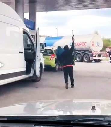 Ante la tensión, un hombre que esperaba su turno bajó de su furgón y disparó al aire para ahuyentar a los ocupantes del auto.