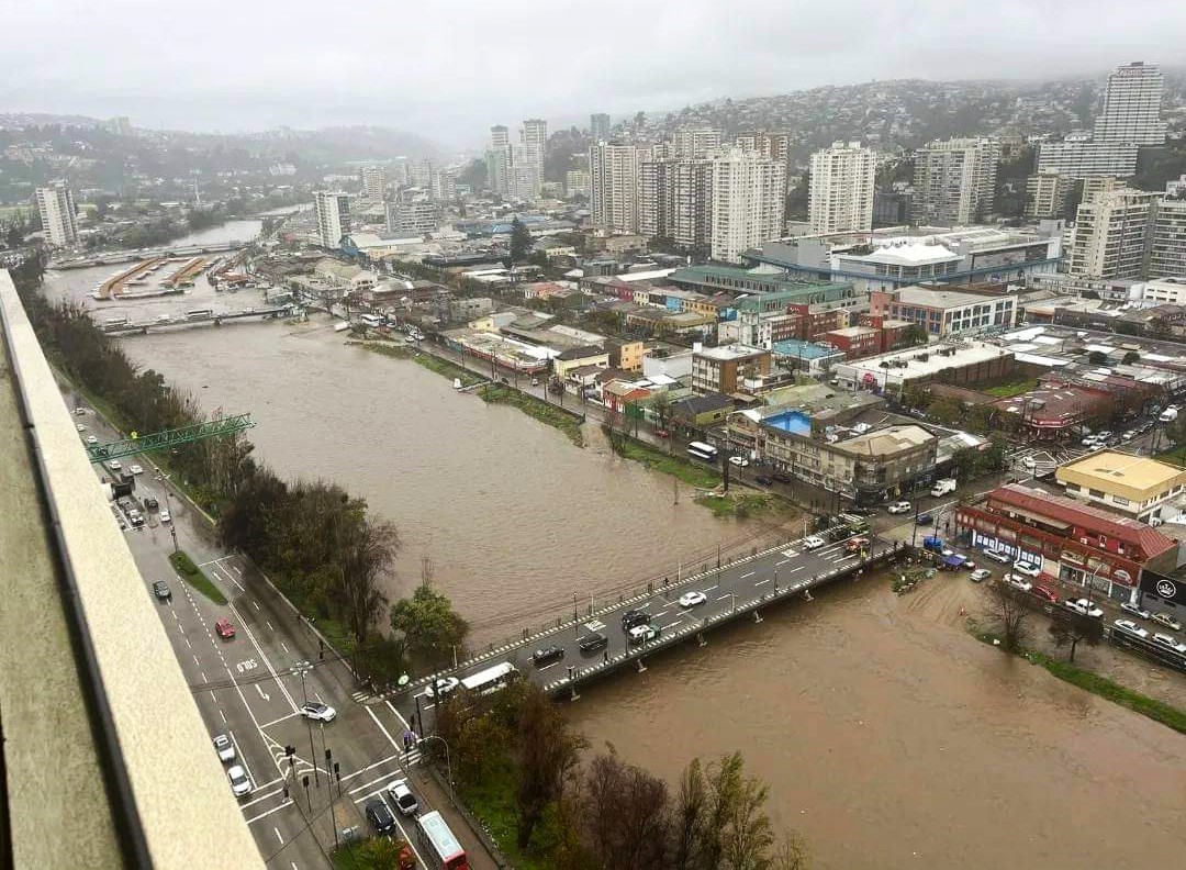 En Viña del Mar se reportan 132 milímetros de lluvia en las últimas 20 horas. Eso provocó un enorme caudal en el estero Marga Marga (foto principal), que dejó bajo el agua los puestos de la feria emplazada en el lugar.