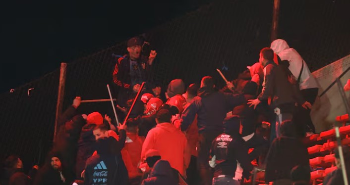 La violencia se inició en el primer tiempo, después de que la U abriera la cuenta a través de Lucas Assadi (11’). Parte de los 3.500 hinchas azules ubicados en la bandeja superior de la tribuna lanzaron butacas, piedras y mampostería de los baños.