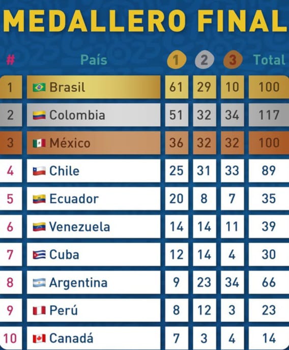 Con una delegación de 113 paradeportistas en 14 disciplinas, el equipo de Chile logró el cuarto puesto tras Brasil, Colombia y México. Ganó 89 medallas en siete deportes: 25 de oro, 31 platas y 33 bronces, triplicando las 29 conseguidas en Bogotá hace dos años.